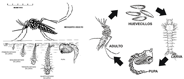 Cuando los huevos eclosionan salen larvas que pasan por cuatro estadios de desarrollo, en un período promedio de ocho días, donde tienen forma de “culebrilla” y se mueven ágilmente en el agua. En la fase de pupa pasan dos días sin alimento hasta convertirse en el mosquito adulto que conocemos.