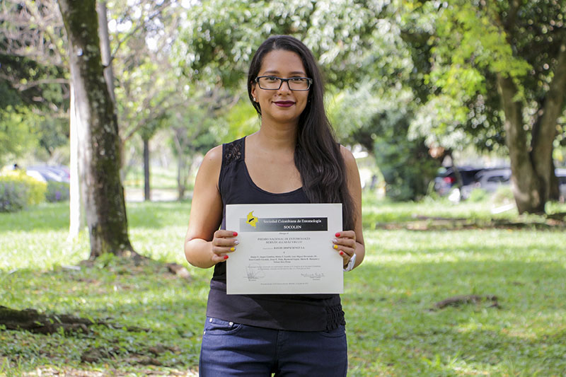Diana N. Duque-Gamboa, estudiante del Doctorado en Ciencias – Biología, de la Universidad del Valle, fue galardonada en el 42° Congreso de la Sociedad Colombiana de Entomología - SOCOLEN, con el Premio Nacional de Entomología “Hernán Alcaráz Viecco”, otorgado al mejor trabajo presentado por profesionales. (Si bien la distinción fue otrorgada el año pasado, por cuestiones logísticas el certificado llegó a manos de la estudiante este año).
