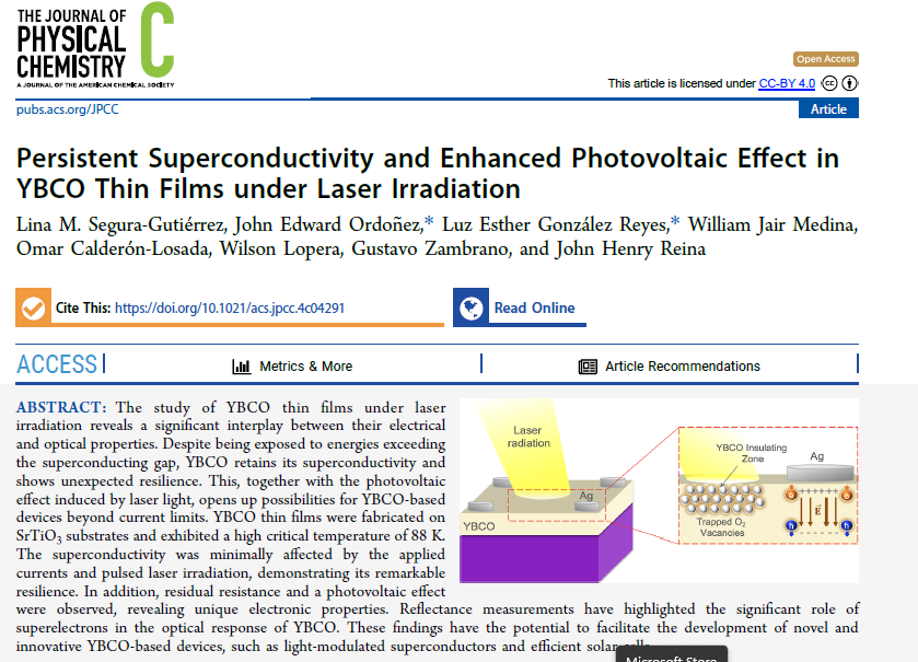 Un equipo de investigadores del Departamento de Física de la Universidad del Valle, liderado por el profesor Gustavo Zambrano, en colaboración con la profesora Luz Esther González de la Universidad de Ibagué, publicaron recientemente el artículo titulado: “Persistent Superconductivity and Enhanced Photovoltaic Effect in YBCO Thin Films under Laser Irradiation” (https://doi.org/10.1021/acs.jpcc.4c04291), en la revista The Journal of Physical Chemistry C de la ACS.