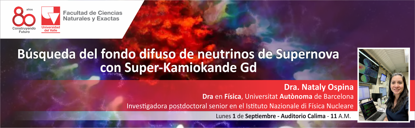 Conferencista: Dra. Nataly Ospina, física de la Universidad del Valle y Doctora en Física de la Universidad Autónoma de Barcelona. Actualmente investigadora postdoctoral Senior en el Istituto Nazionale di Física Nucleare y profesora honoraria de la Universidad Autónoma de Madrid. Su trabajo se centra en la búsqueda de neutrinos provenientes de fuentes astrofísicas, participando en las colaboraciones Super-Kamiokande, Hyper-Kamiokande y T2K.